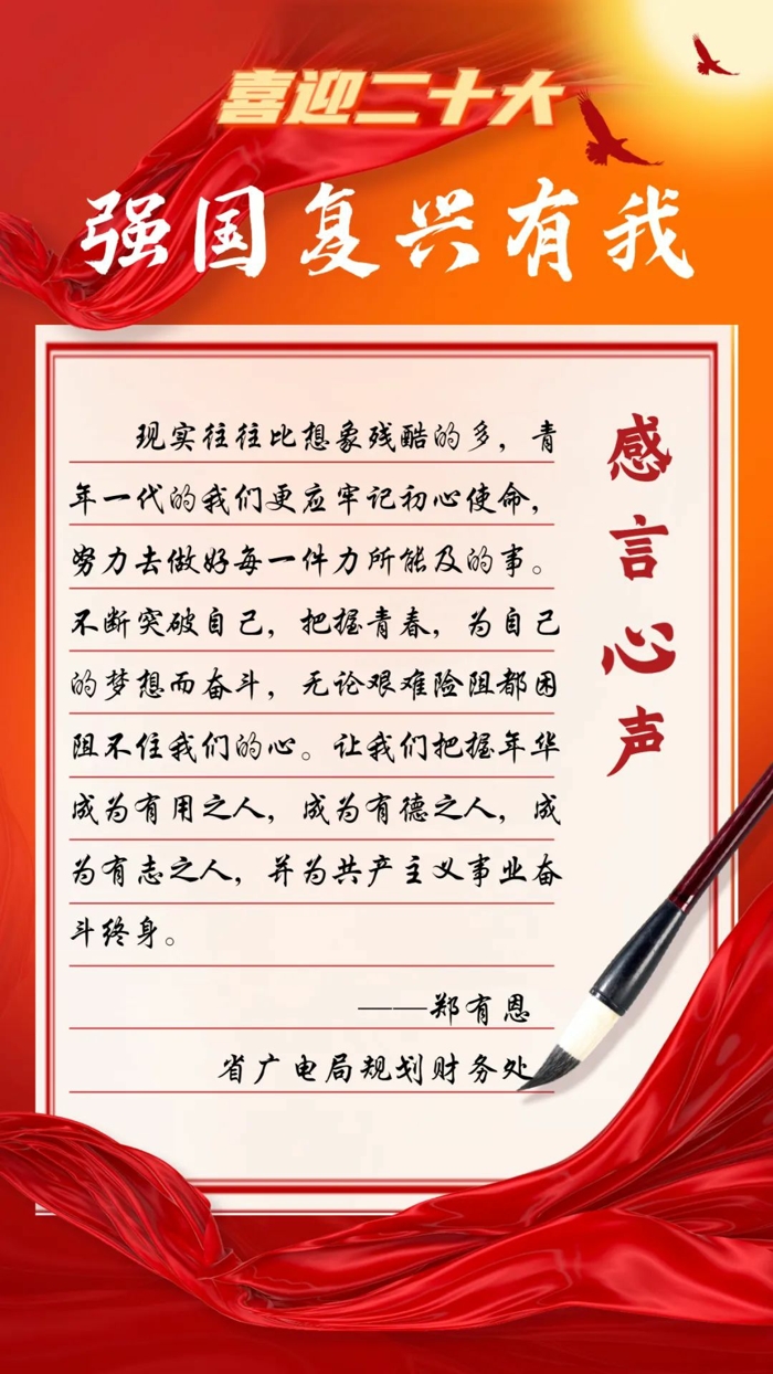 为迎接党的二十大胜利召开,省广电局结合“喜迎二十大·奋进新征程”系列活动,机关党委、机关团委组织广大青年党员围绕“喜迎二十大 强国复兴有我”主题向党的二十大寄语,结合实际深情回顾、热情畅谈党的历史和重大成就,说心声、话成就、谈感受,切实增强做好广电工作的责任感和使命感,集中展现广电青年坚守初心、砥砺前行、忠诚担当的深情感言和心声告白,把对党的二十大的热切期盼转化为实干担当的坚定行动。