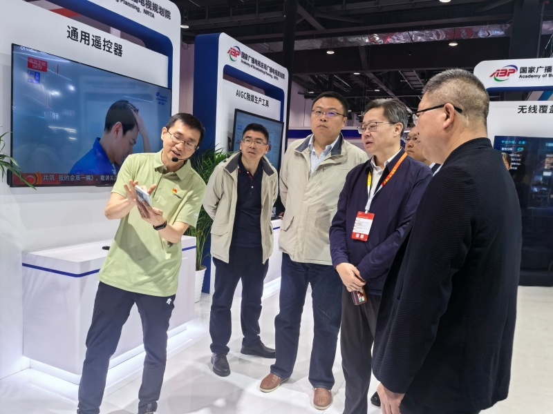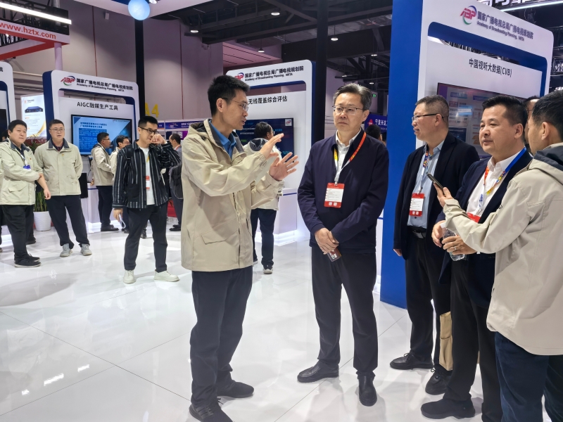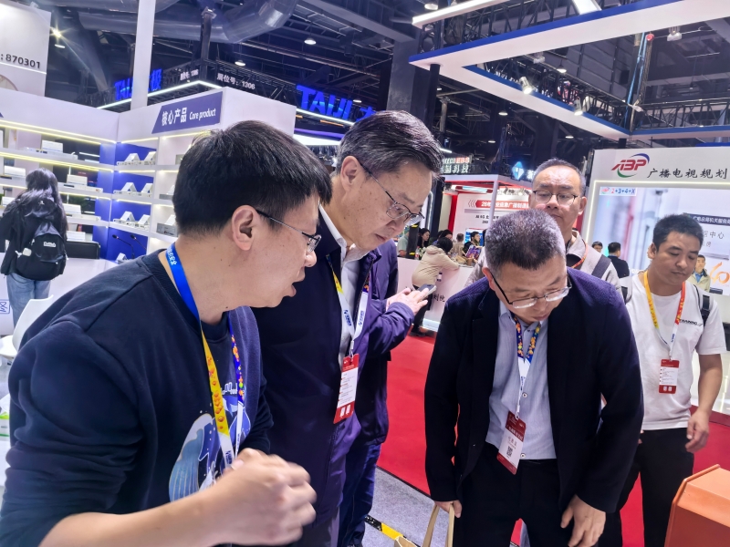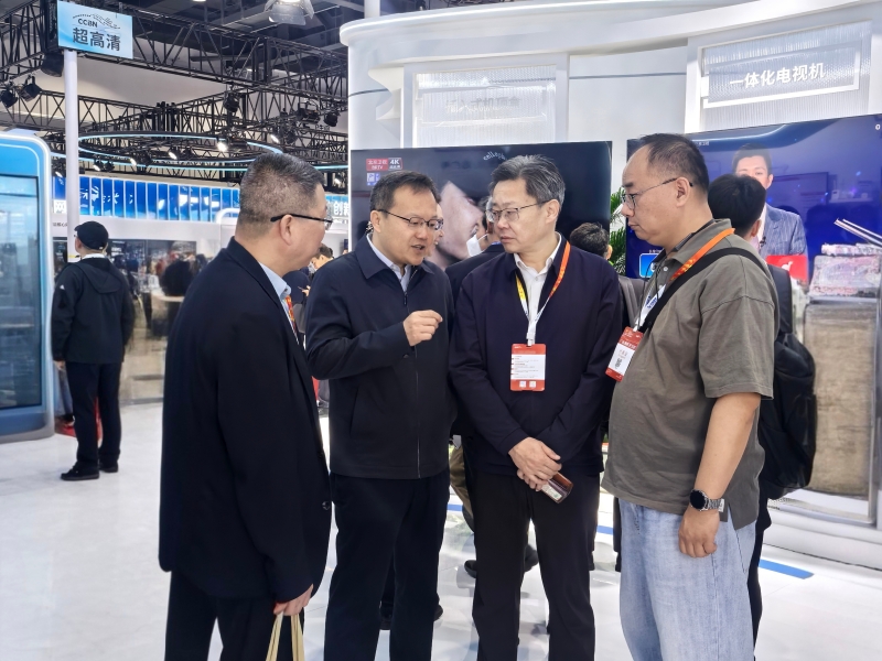 张新文一行在CCBN2025展览中全面了解超高清、“双治理”、新型广电网络建设、人工智能(AIGC)、互联网电视、视听制作、应急广播、传输与覆盖、网络安全等高新技术在广播电视和网络视听行业的广泛深度融合应用情况,重点参观了中国广电、广科院、设计院、规划院展台,详细了解广播电视发展前沿,与参展企业进行了深入交流。